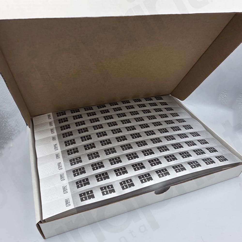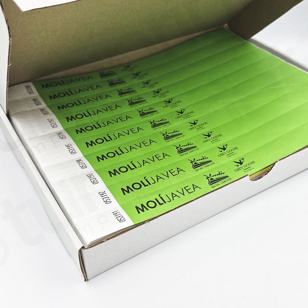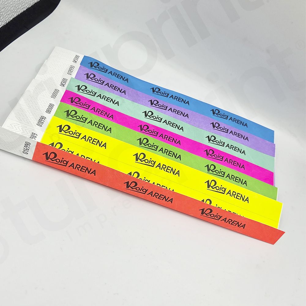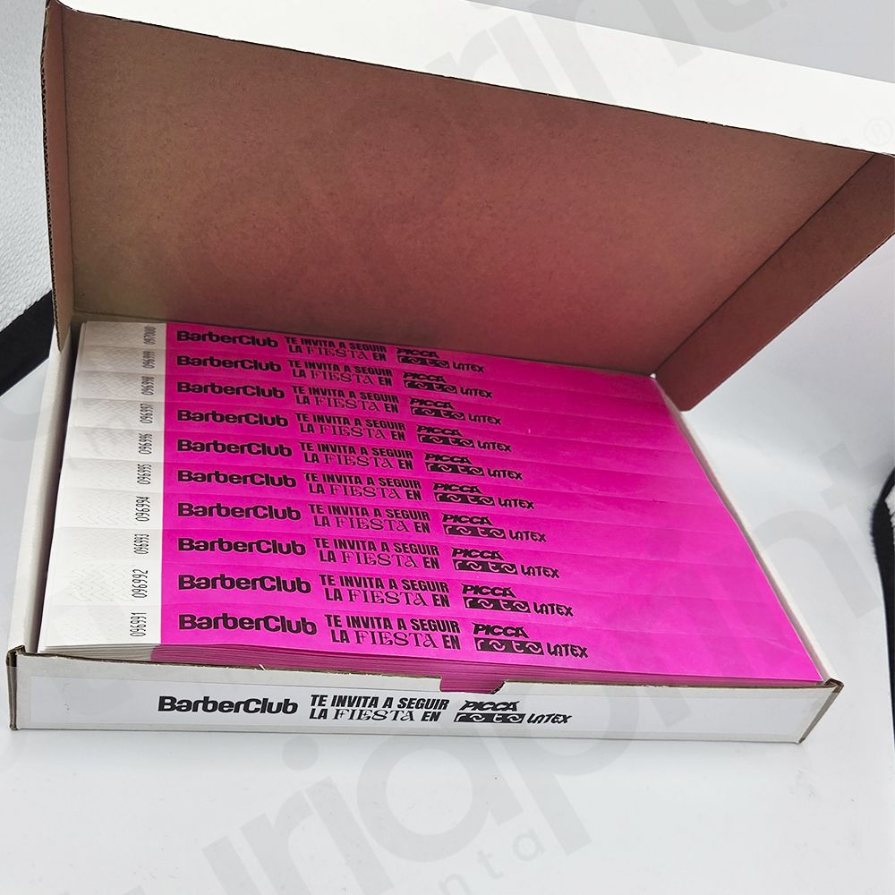 - Las Pulseras Tyvek son pulseras de papel sólido de un solo uso, con un número de serie pre-impreso y con un cierre inviolable que impide la transferencia de la pulsera de una persona a otra. Las pulseras personalizadas de TuriaPrint son intransferibles y resistentes al agua, tirones y con un fuerte cierre adhesivo. Son, recomendadas para eventos, festivales, clubs, fiestas, zoológicos, parques, etc. Están disponibles en varios colores, personalizables con texto y logotipos.
